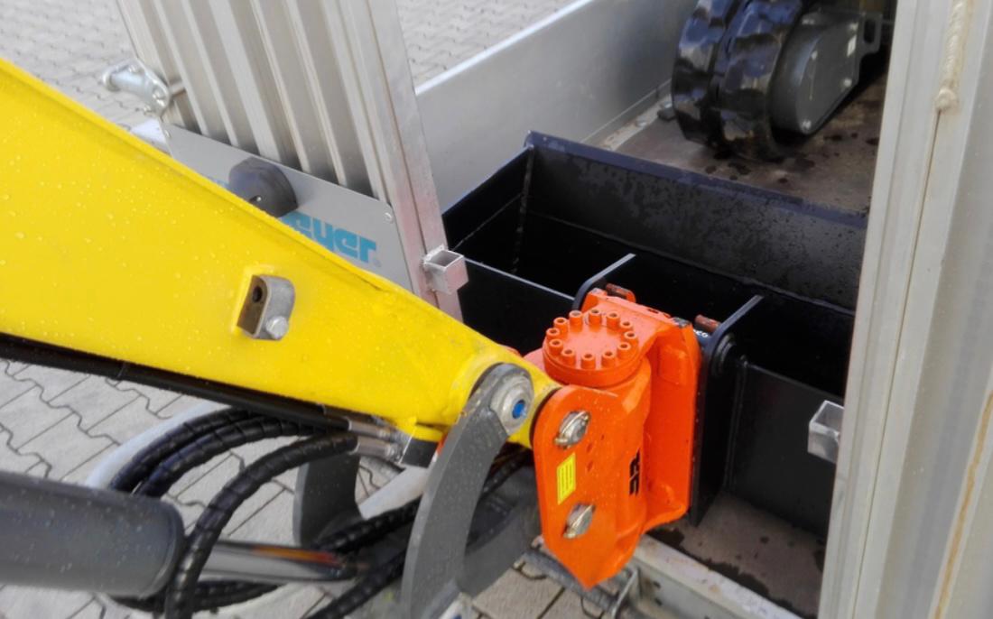 Das Dach kann ganz einfach mit Hilfe von Bordseitigem Werkzeug vollständig entfernt werden, wodurch der Bagger auch durch Garagen kleinere Tore und kleine Gärten passt.